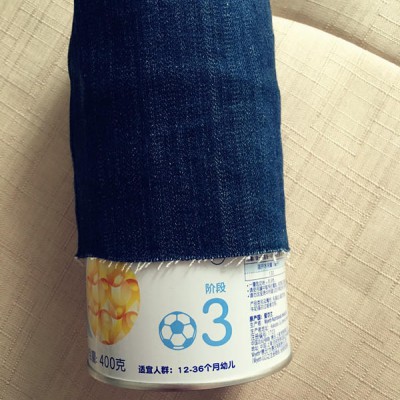 1. 比着奶粉罐的高度将牛仔裤裤脚剪下。